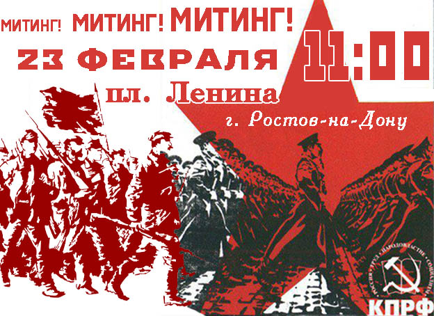 В Ростове-на-Дону митинг, посвященный 108-й годовщине со дня образования Рабоче-крестьянской Красной Армии и Военно-Морского флота, состоится на площади Ленина 23 февраля в 11 часов.