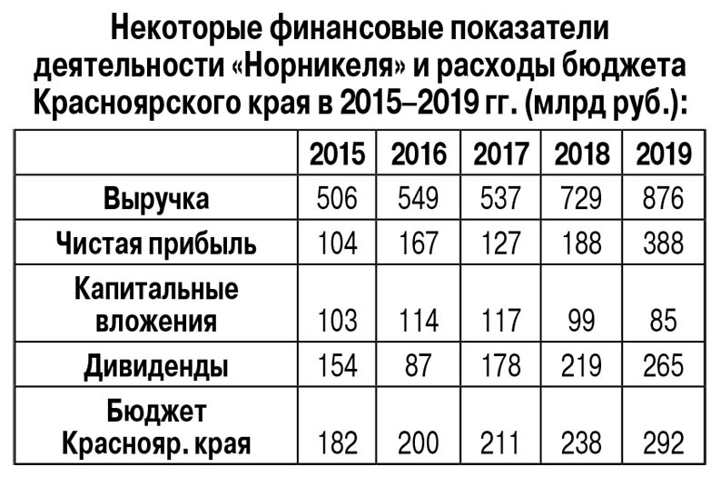 Экологическая катастрофа в Норильске заставила власти в Москве разбираться с состоянием дел на комбинате. Были заседания правительства и обеих палат Государственной Думы. Выяснилось, что руководство «Норникеля» думает не столько о поддержании и развитии комбината, города Норильска и всего Красноярского края («Норникель» – самое крупное предприятие края), сколько о прибылях и дивидендах. Этот вопрос обсуждался на заседании Совета Федерации 28 октября 2020 года. Там были представлены интересные материалы. Приведу одну таблицу из этих материалов.