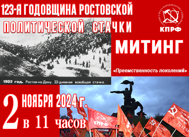 Товарищи! Приглашаем Вас на митинг, посвященный 123-й годовщине Ростовской политической стачки 1902 года, который начнётся 2 ноября в 11 часов на площадке перед памятником "Преемственность поколений" (Стачке 1902 года).