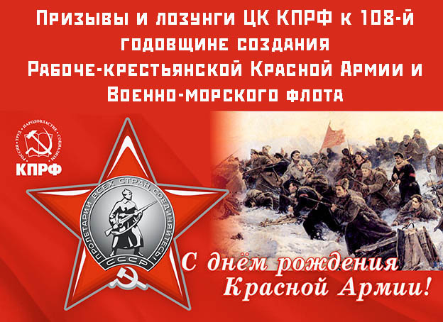 Публикуем призывы и лозунги ЦК КПРФ к 108-й годовщине создания Рабоче-крестьянской Красной Армии и Военно-морского флота.