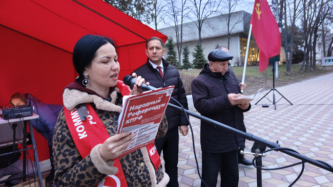«Тридцать пять лет назад народ сделал свой выбор, но верхушка предателей его растоптала. Сегодня мы видим, к чему это привело: разрушенные производственные цепочки, межнациональные конфликты и утрата социальной защищенности, которая была эталоном для всего мира», — отметила выступающая на митинге второй секретарь Ростовского ОК КПРФ Инна Куцаева, - «КПРФ настойчиво добивается возвращения гражданам права высказываться на референдуме по важнейшим вопросам развития страны, устройства политической и социально-экономической системы. По Конституции единственным источником власти в России является народ. Из неё вытекает, что у общества должна быть реальная возможность голосовать не только на выборах, во время которых власти предержащие любят частенько подтасовывать волеизъявление граждан, но и на референдумах, позволяющих скорректировать политику, которая не устраивает граждан. Однако действующая власть упорно уклоняется от этого, потому что понимает: если дать народу такую возможность, он неизбежно выскажется против самих основ системы, заложенной в кровавом октябре 1993-го.