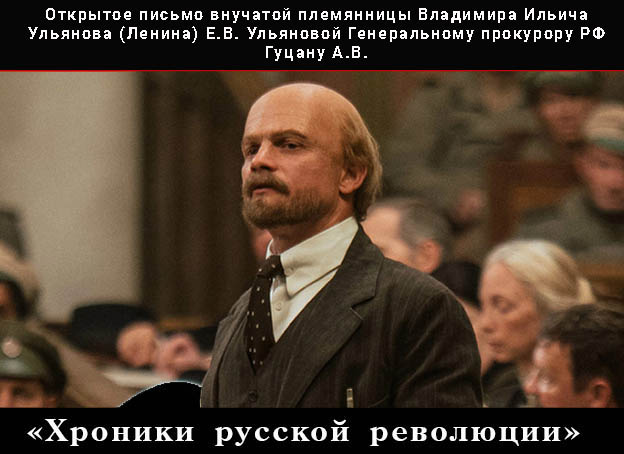 Прошу Вас рассмотреть возможность публикации Открытого письма Генеральному прокурору РФ Гуцану А.В., где речь идет о попытке нашей семьи защитить честь и достоинство нашего покойного родственника, В.И. Ульянова (Ленина), от клеветнических измышлений со стороны создателей сериала «Хроники русской революции».