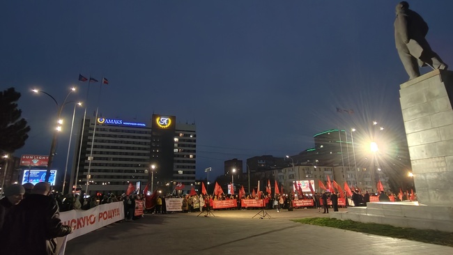 И пока на площади шли приготовления к началу мероприятия – монтировалась и устанавливалась шестиметровая растяжка «Есть у революции начало, нет у революции конца!», разворачивалось звукоусиление и осветительные мачты, подходившие участники митинга разбирали Красные флаги, - на площади для спешащих с работы жители города и участников митинга в течение получаса звучали знакомые советские мелодии в исполнении духового оркестра и советские песни в живом исполнении солиста.
